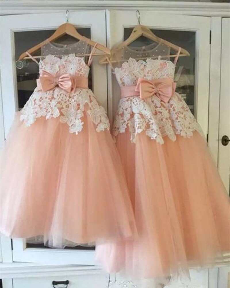 Lace Applique White and Pink Long Tulle with Bow Flower Girls Dress Kid's Party Prom White First Communion Pageant Clothing for Baby D06