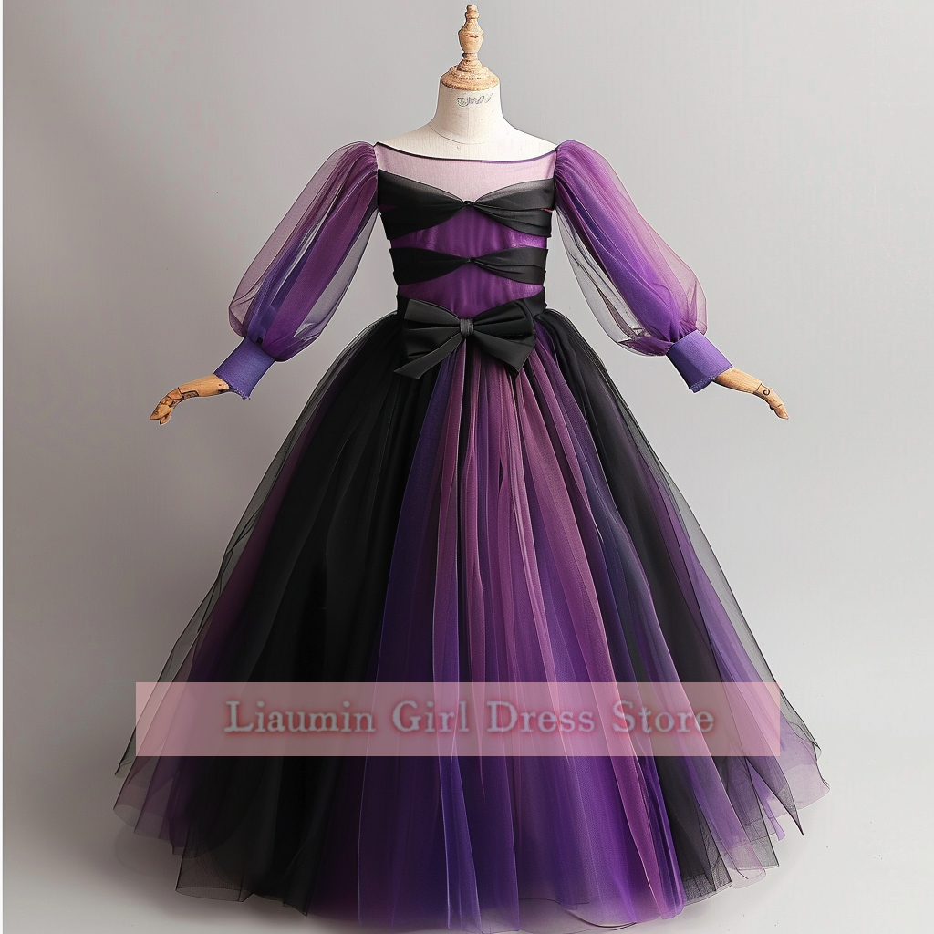 Cute Purple And Black Tulle Long Sleeve Flower Girl Dresses Brithday Party Princess First Communion Pageant Child Skirt W8-9.8