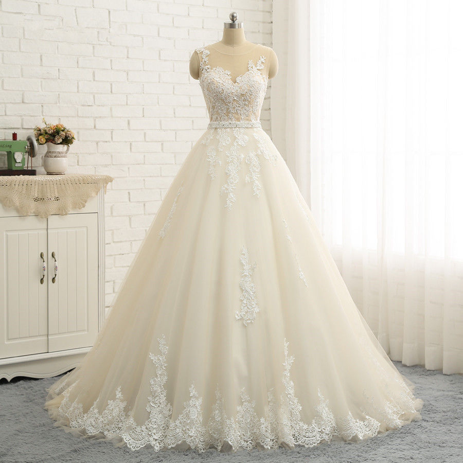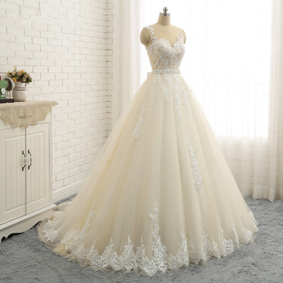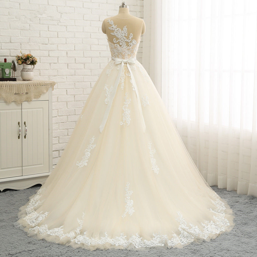 Champagne Lace Applique Wedding Dress Bridal Gown Prom Evening Dress