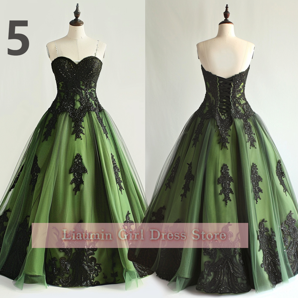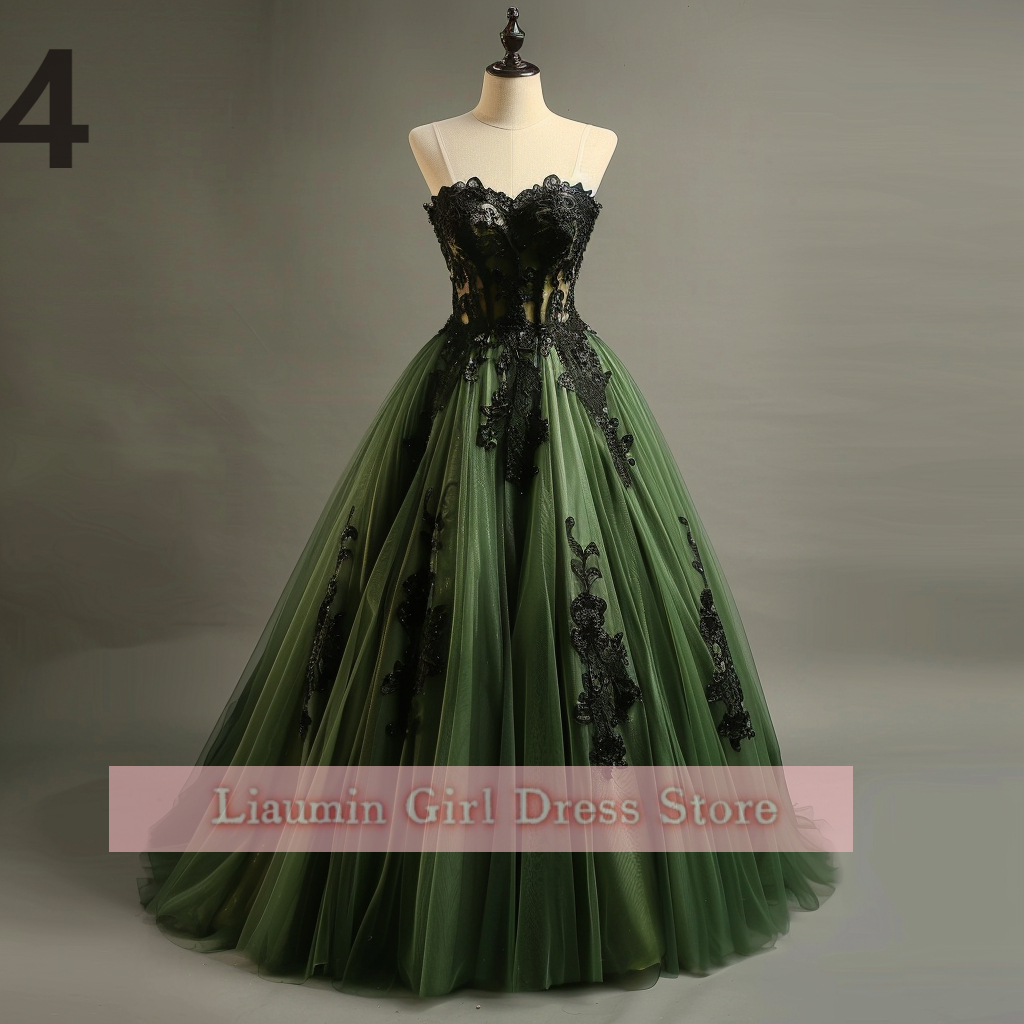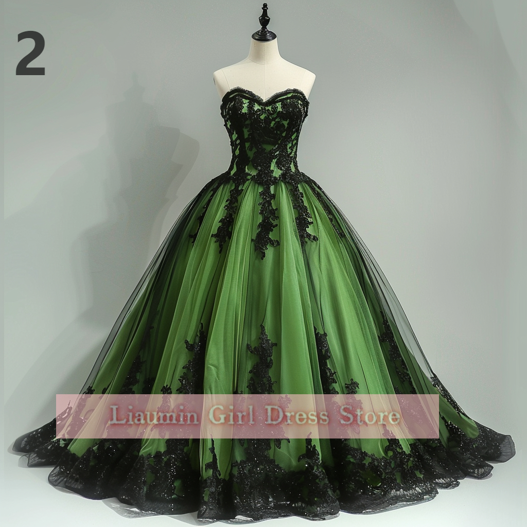 Green and Black Lace Applique Tulle Strapless Ball Gown Full Length Evening Formal Party Prom Dress Hand Made Custom Size W11-5