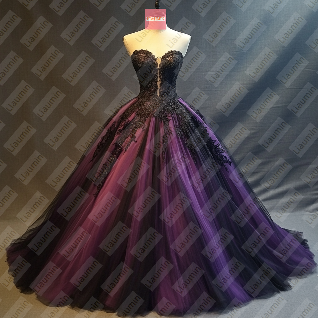 Purple Tulle and Black Lace Strapless Wedding Formal Prom Evening Dress Full Length Custom Hand Made W19-12.3