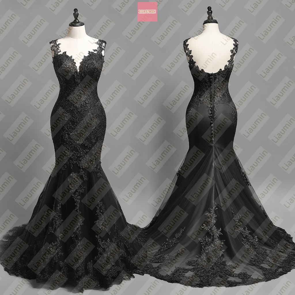 Black Tulle and Lace Applique Lace-up Back Formal Prom Wedding Formal Evening Dress Full Length Custom Hand Made W19-15.1