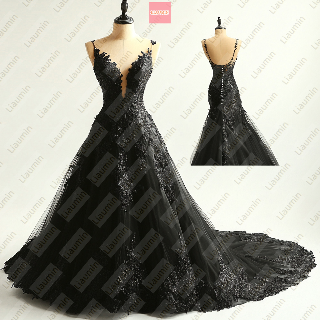 Black Tulle Lace Applique Lace-up Back Formal Prom Wedding Formal Evening Dress Full Length Custom Hand Made W19-15.4