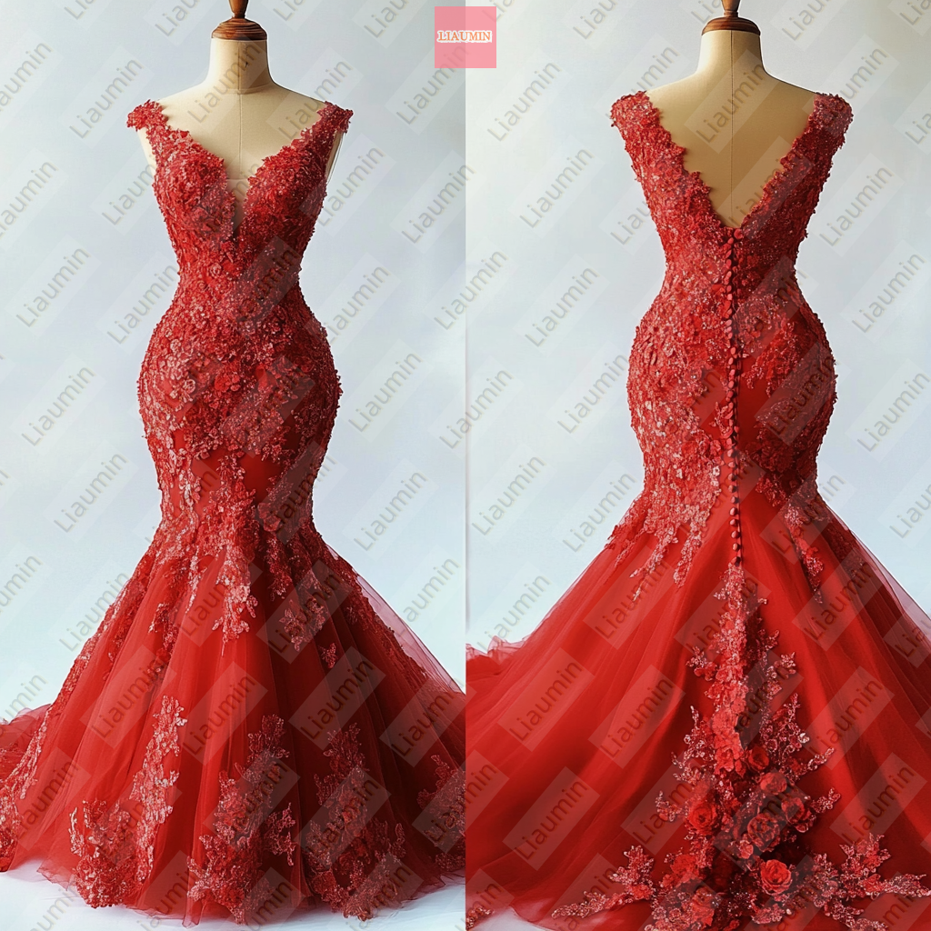 Red Mermaid Lace-up Back Formal Prom Wedding Formal Evening Dress Full Length Custom Hand Made W19-15.7