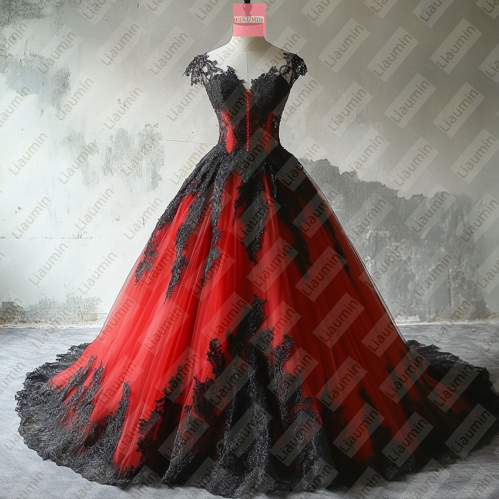 Red Tulle and Black Lace Applique Formal Prom Wedding Formal Evening Dress Custom W19-17.1