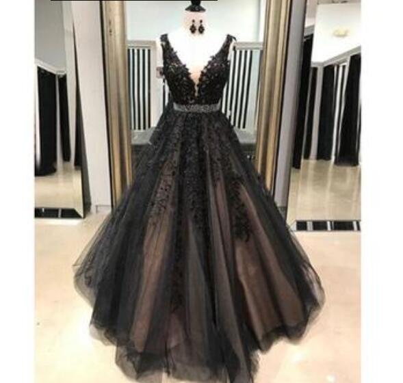 Lace Applique Sexy V Neck Black Women Prom Dress Evening Dress Formal Occasion Party Dress