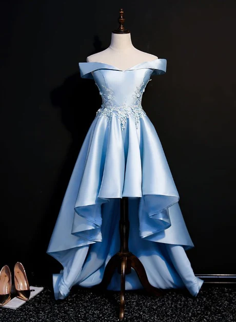 Light Blue Satin with Lace Applique High Low Homecoming Dress, Blue Short Off Shoulder Formal Dress