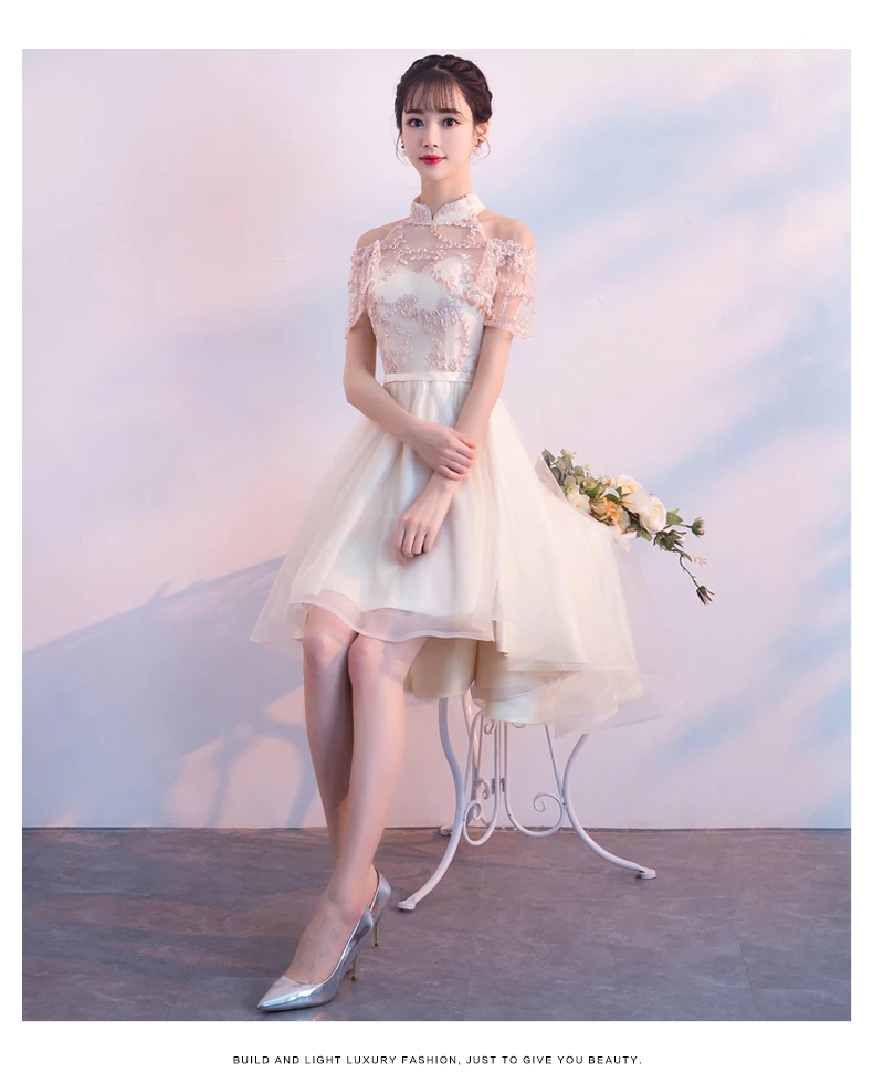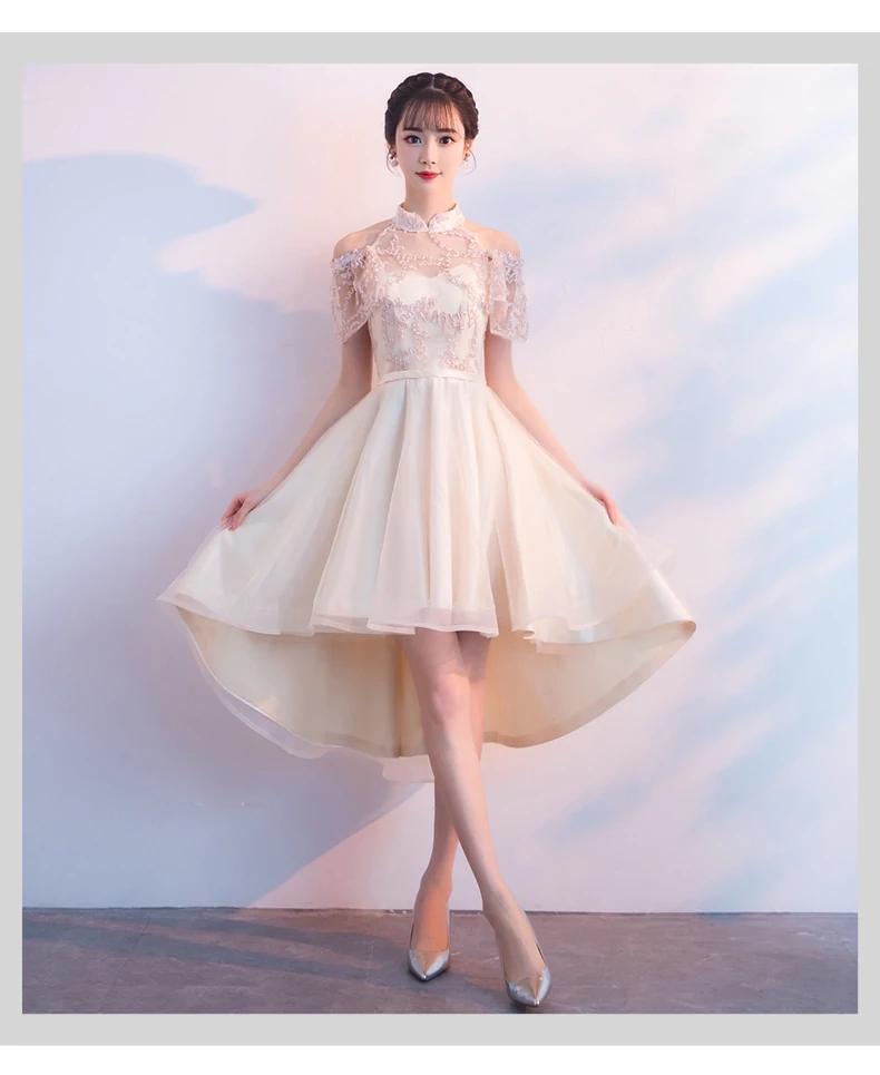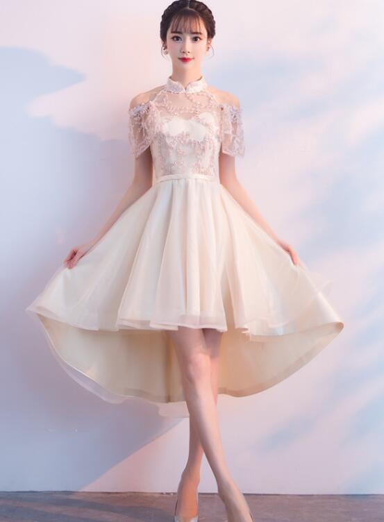 Light Champagne Halter Lace and Tulle High Low Party Dress, Champagne Homecoming Dress