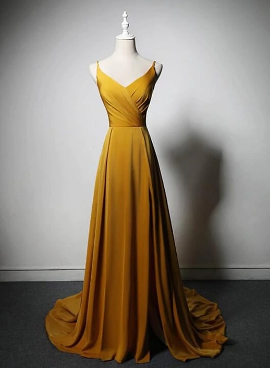 Goleden V-neckline Straps Long Party Dress with Leg Slit, Long Gold Evening Dress Prom Dress