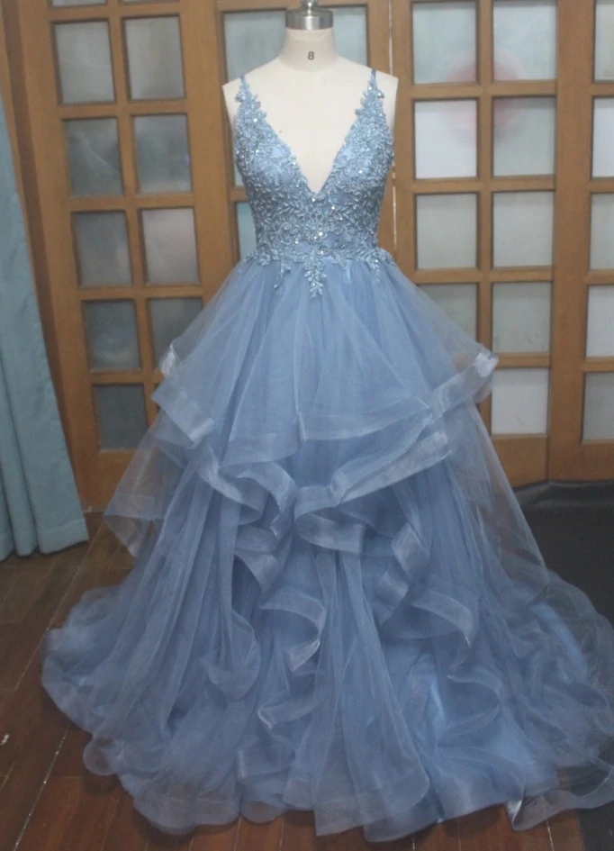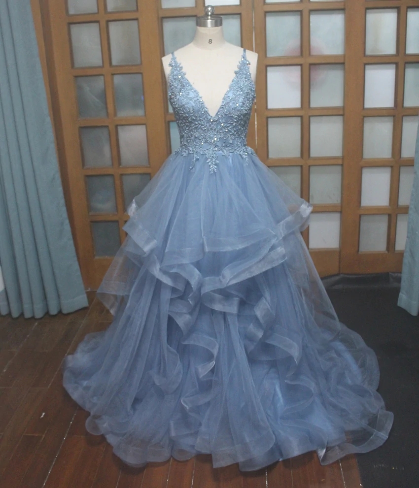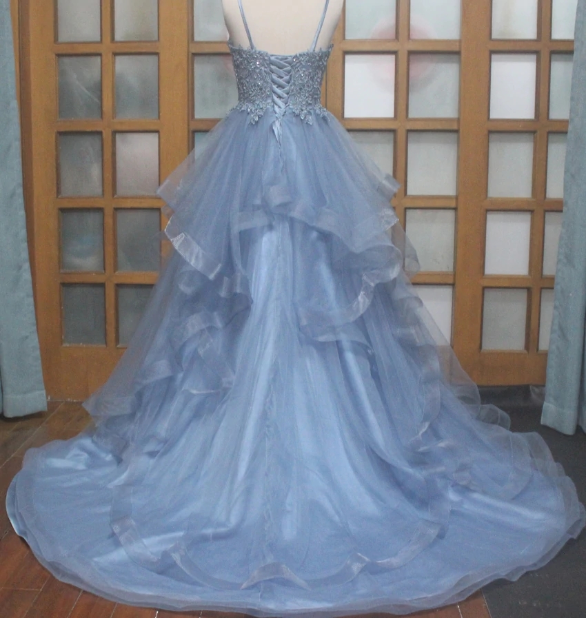 Blue Straps Layers V-neckline Lace Applique Formal Dress, Blue Gown Party Dress