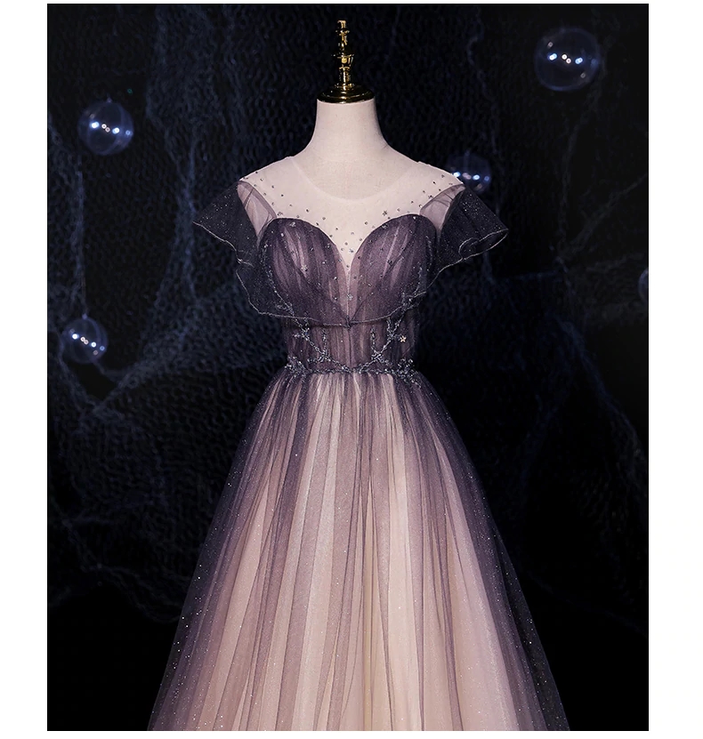 Charming Tulle Gradient Cap Sleeves Long Party Dress, A-Line Evening Gown