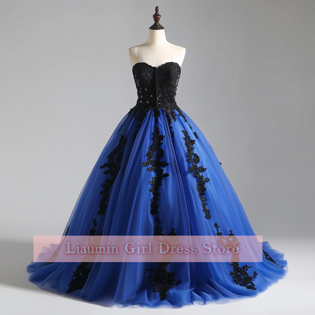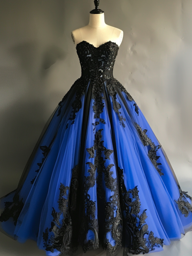Blue and Black Lace Applique Strapless Ball Gown Floor Length Evening Formal Occasion Party Prom Dress Custom Size Color W11-9