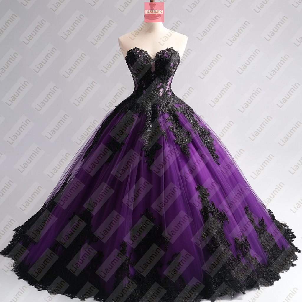 Purple Tulle and Black Lace Strapless Full Length Prom Dress Evening Dress Custom Hand Made W19-12.5
