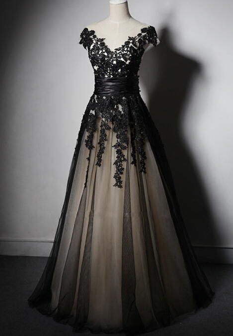 V Neck Lace Applique Full Length Black Women Prom Dress Evening Dress Formal Occasion Party Dress
