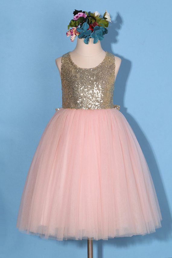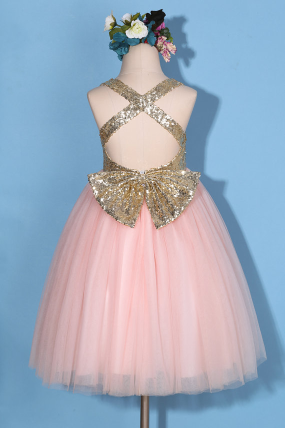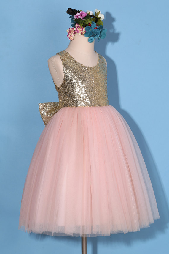 Flower girl dress/Gold pink flower girl dress/gold sequin dress/pink tulle dress/sequin flower girl dress with bow/pink pageant dress