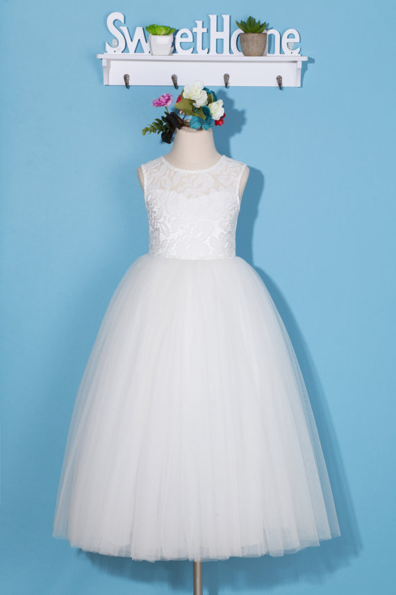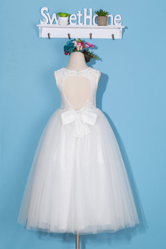White lace flower girl dress/tulle flower girl dress/pageant dress/communion dress/toddler girl dress/backless flower girl dress