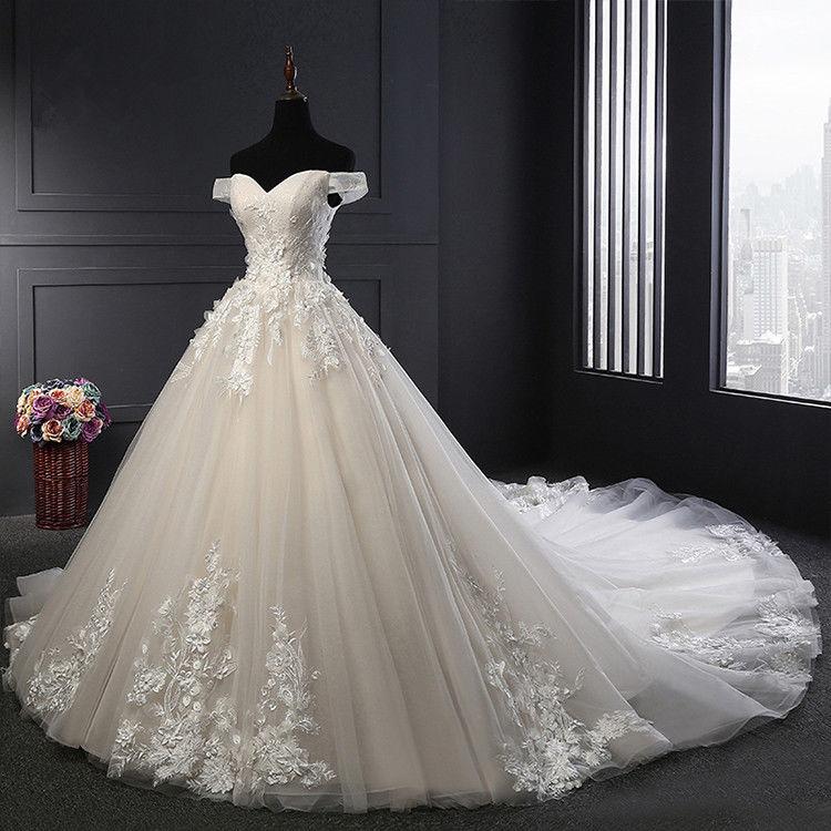 Elegant Off Shoulder Cathedral Train Lace Applique Wedding Dresses Bridal Gowns Custom Plus Size Wedding Formal Occasion