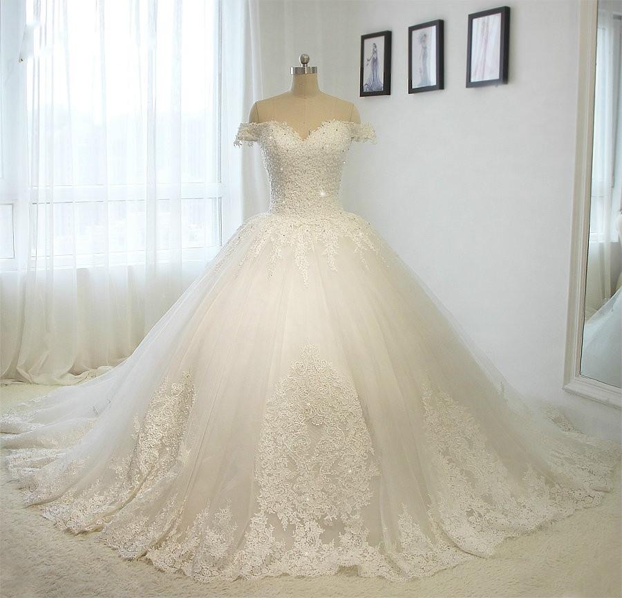 Boat Neck Cap Sleeve Lace Applique Wedding Dress With Long Train Beads Lace Up Back Bridal Gown Pure Hand Made