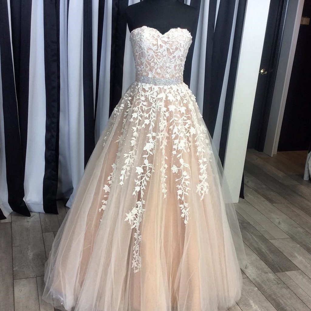 Strapless A-line Lace Tulle Champagne Prom Dresses Sexy Long Evening Dresses