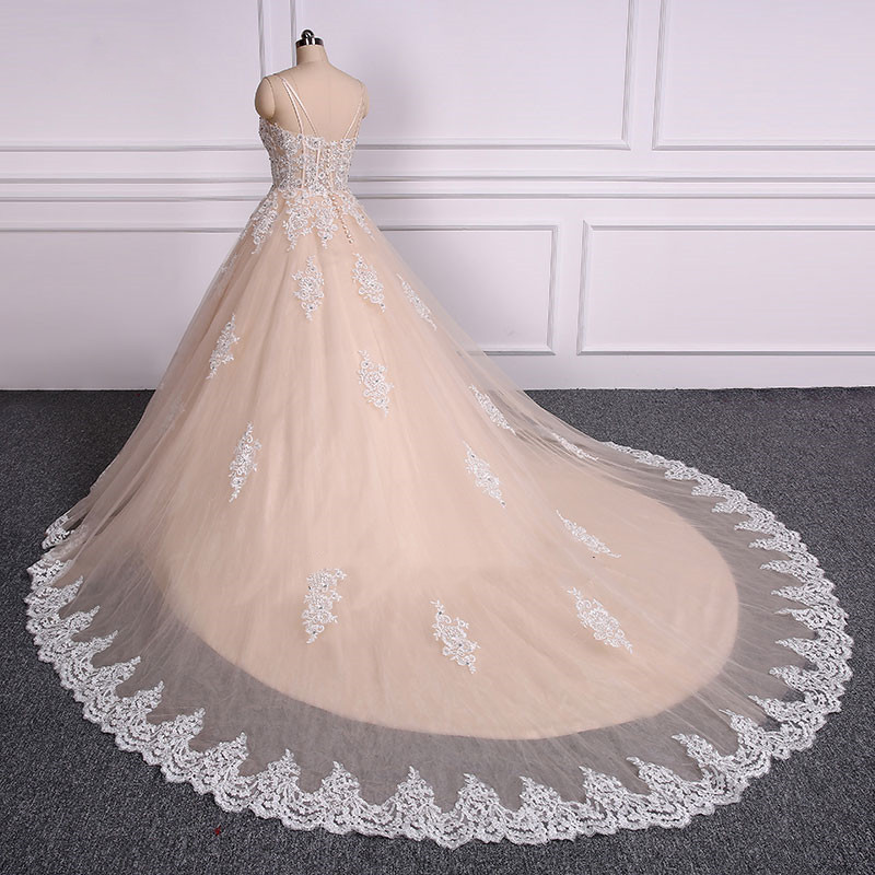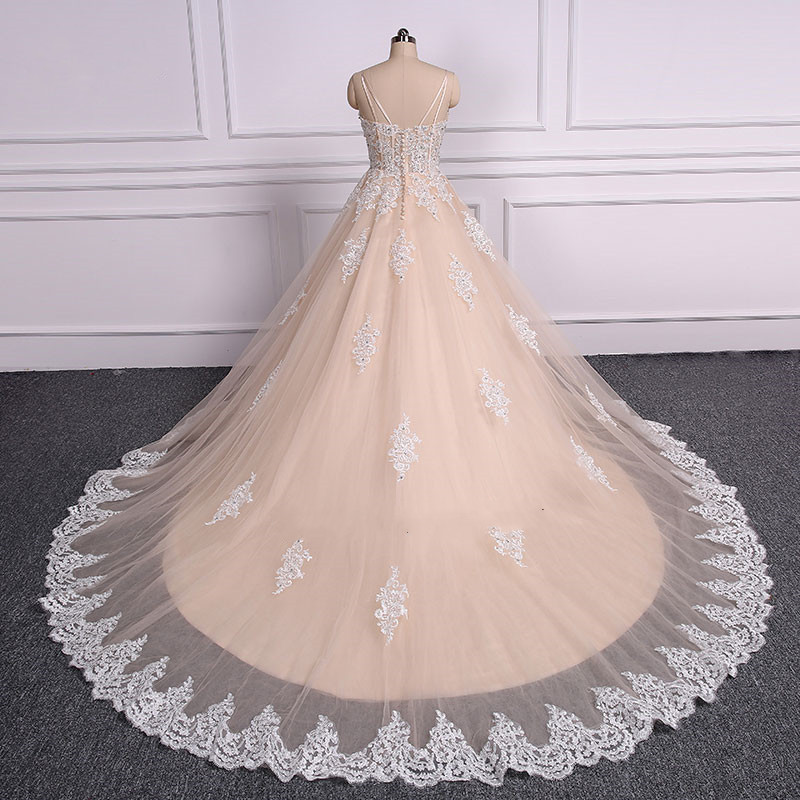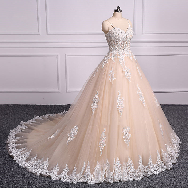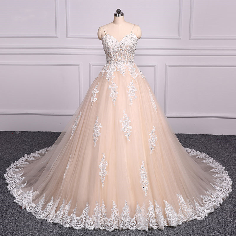 Spaghetti Straps Champagne A Line Wedding Dress Embroidery Floor-Length Court Train Bridal Dress