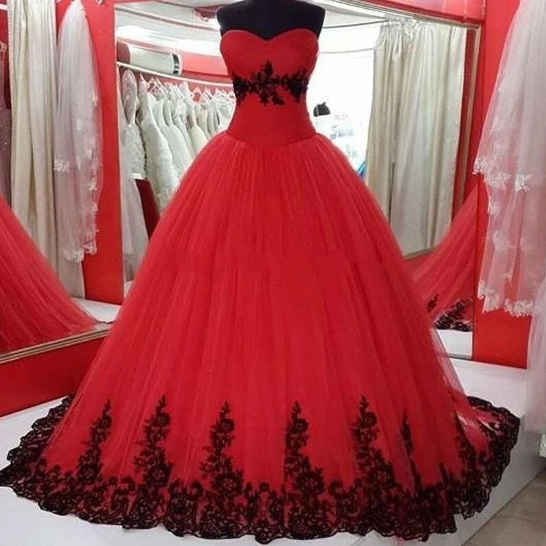 Red and Black Lace Applique Strapless Long Prom Dresses, Cheap Chiffon Prom Dress Elegant Evening Dresses Custom Size,