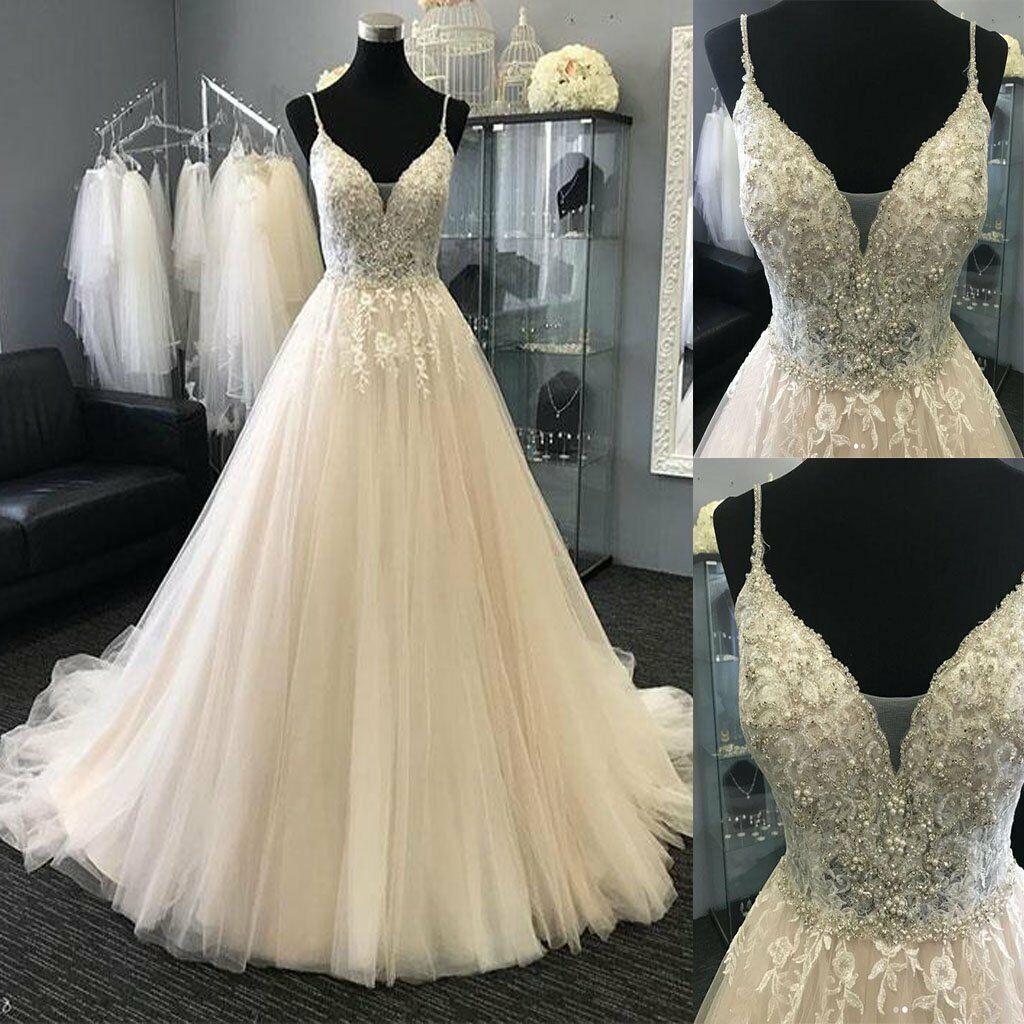 V Neck Tulle Satin Lace Applique Long Wedding DressProm Dresses Elegant Evening Dresses Custom Size