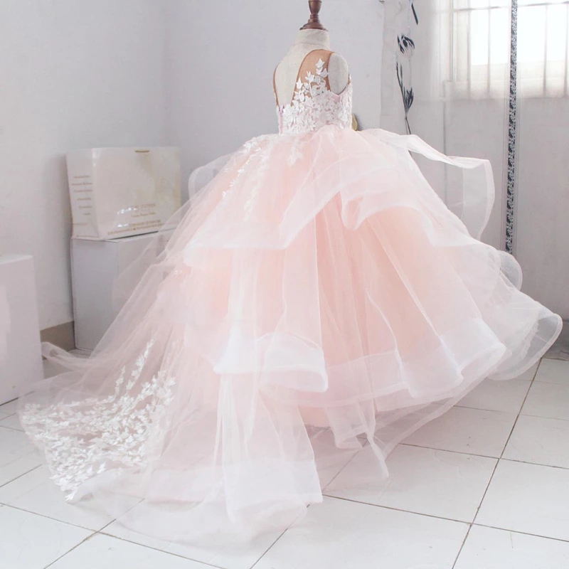 Pink Tulle White Lace Applique Flower Girls Dress Kid's Party Prom White First Communion Pageant Clothing for Baby D012