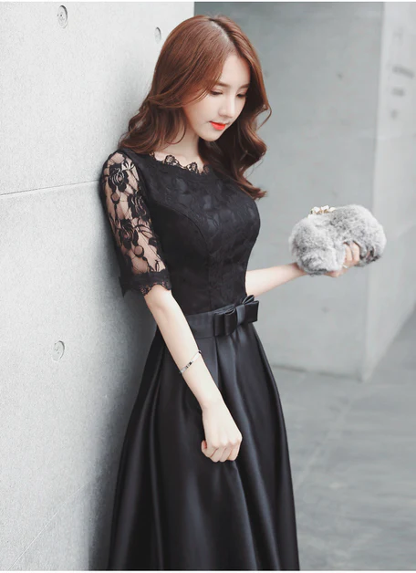 Black Satin with Lace Short Sleeves Long A-line Wedding Party Dress, Black Formal Dress