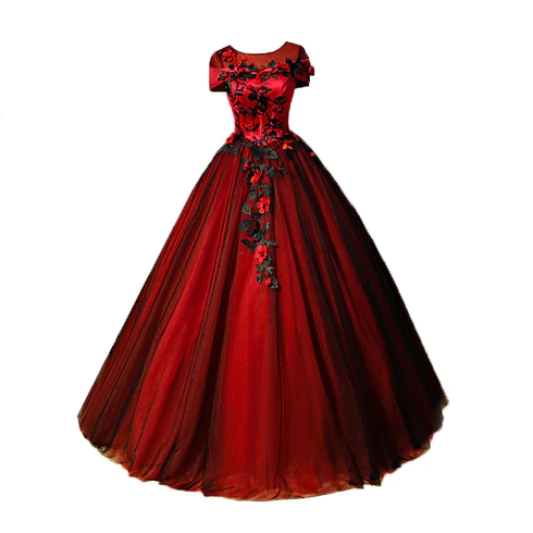 Red and Black Flowers Cap Sleeves Ball Gown Sweet 16 Dress, Princess Long Formal Dress
