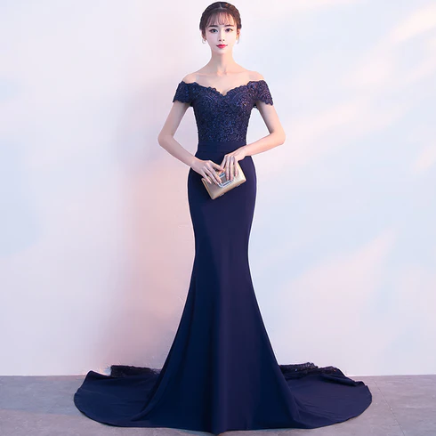Beautiful Navy Blue Mermaid Lace Long Party Dress, Off Shoulder Evening Dress