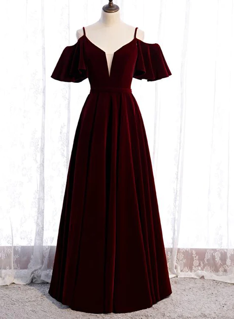 Wine Red Velvet Off Shoulder Floor Length Party Dress, Velvet Junior Prom Dress