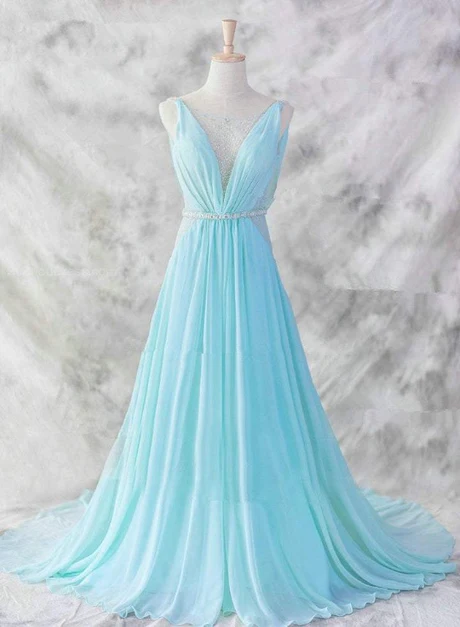 Light Blue Chiffon Backless Long Evening Gown, Blue Party Dress
