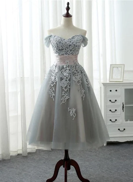 Grey Tea Length Formal Dress with Lace, Grey Bridesmaid Dress