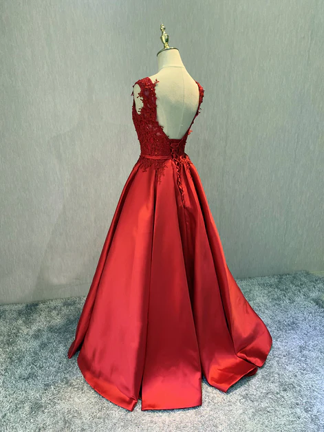 Red Satin V-neckline Floor Length Prom Dress, Backless Red Party Dress