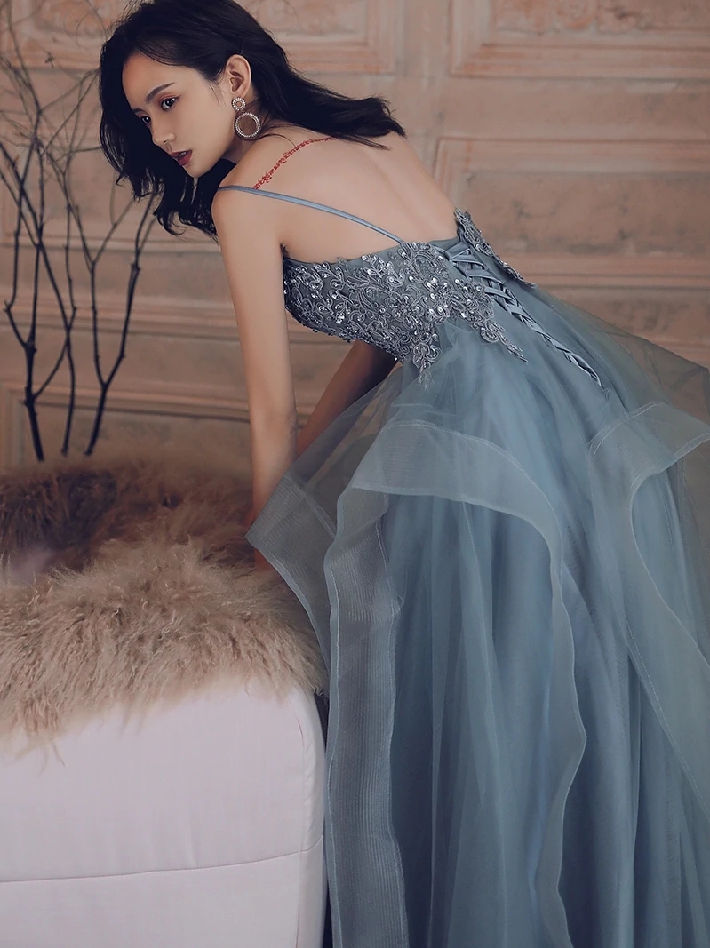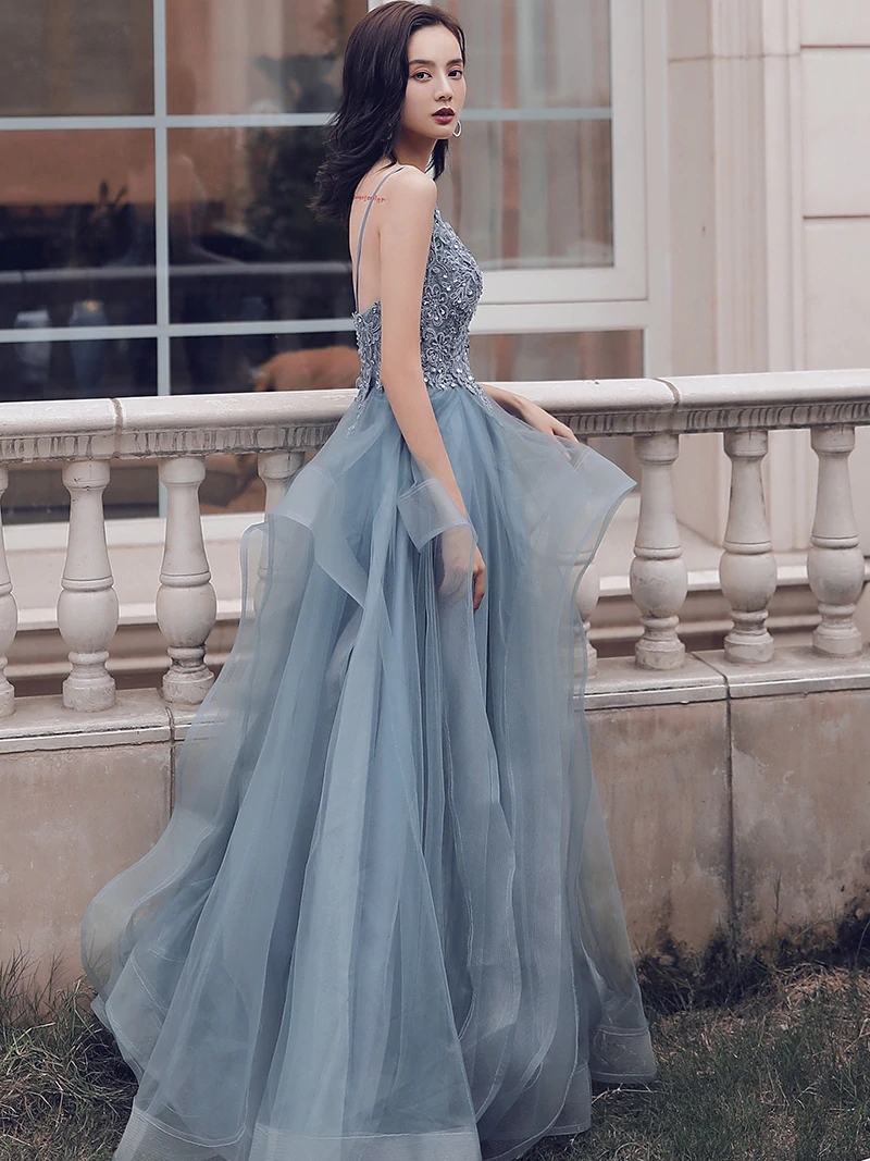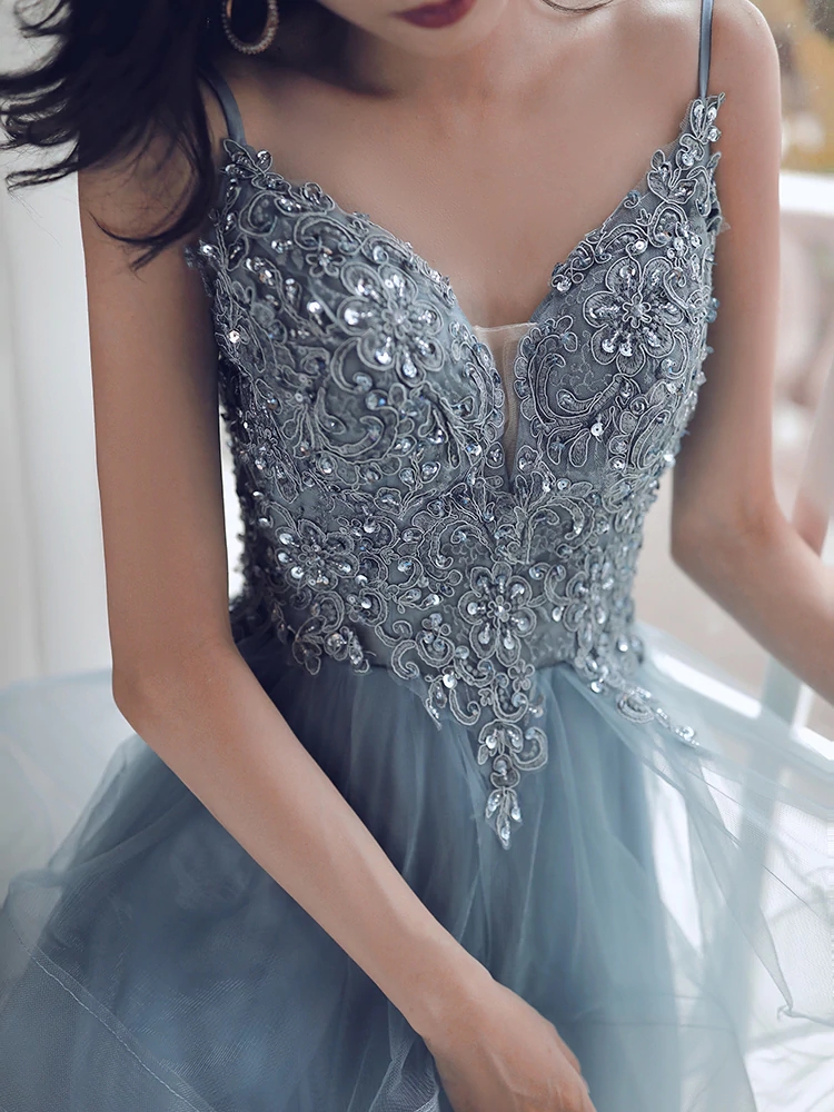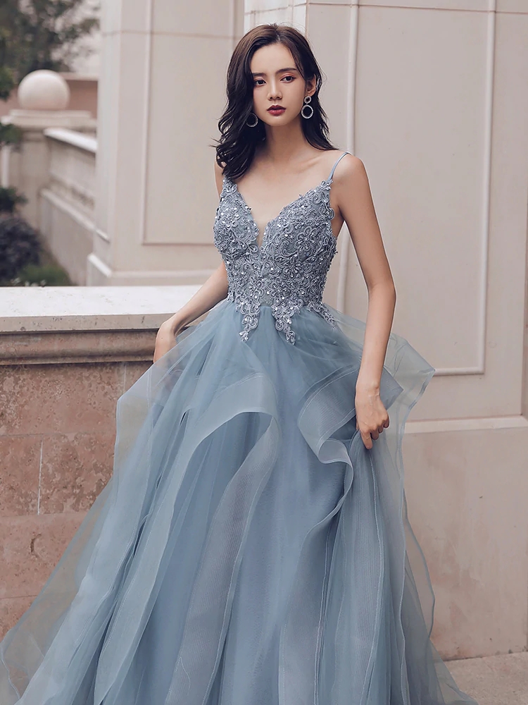 Light Blue Tulle V-neckline Lace Applique Straps Layers Skirt Long Prom Dress, Blue Wedding Party Dress