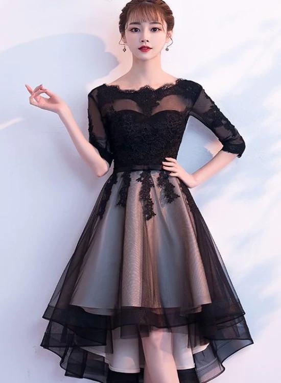 Champagne and black High Low Short Sleeves Party Dress, High Low homecoming Dress Formal Dresses