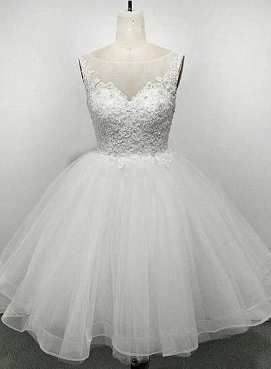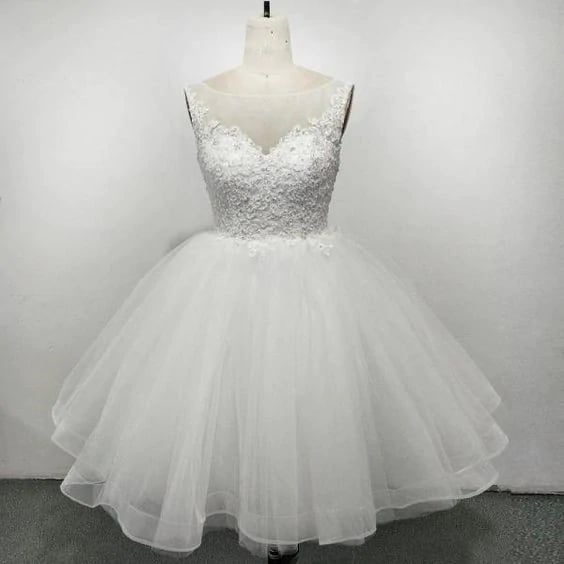 Beautiful White Ivory Tulle Round Neckline Lace Applique Short Party Dress, Short Wedding Party Dress