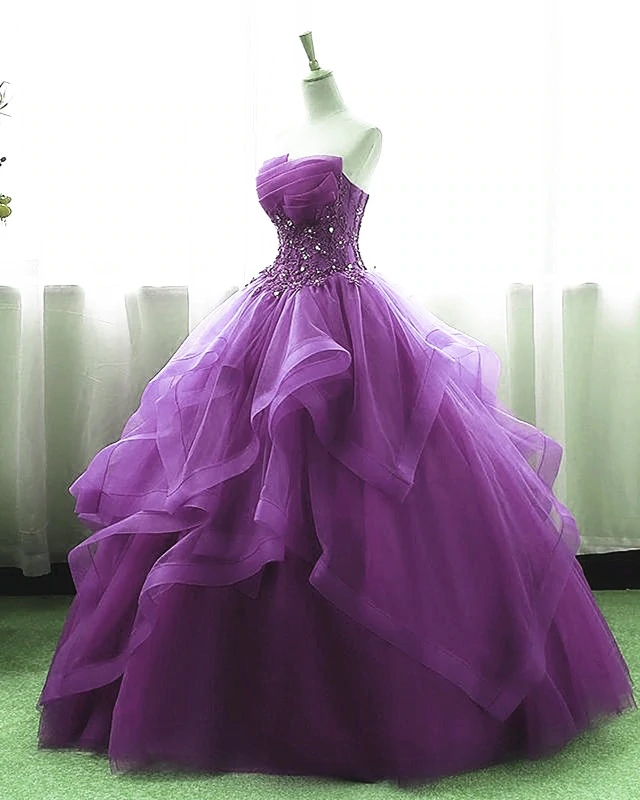 Purple Ball Gown Organza and Tulle Sweet 16 Dress with Lace Appique, Purple Formal Gown