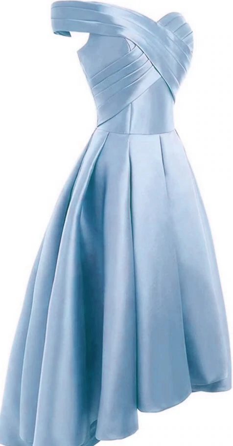 Light Blue Satin Off Shoulder High Low Party Dress Homecoming Dresses, Short Prom Dress