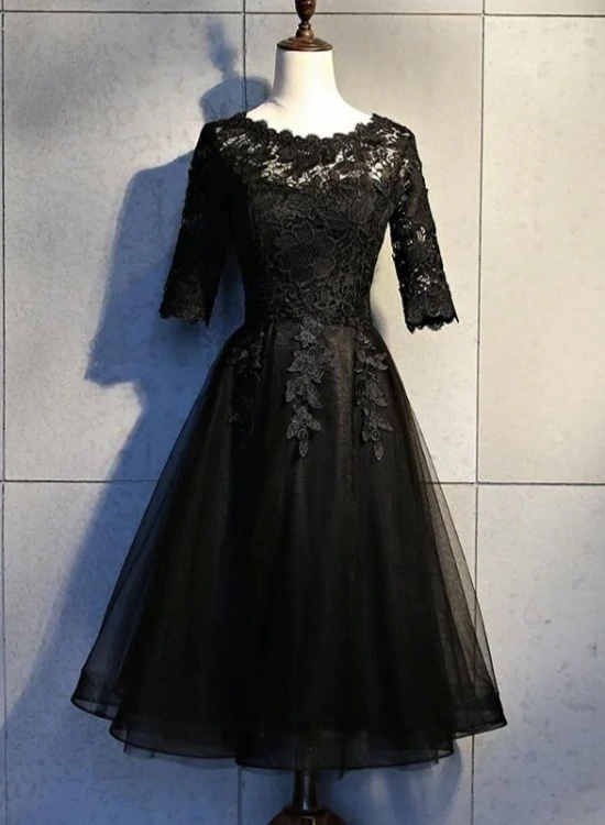 Black Lace and Tulle Short Sleeves Party Dresses Formal Dress, Black Homecoming Dresses