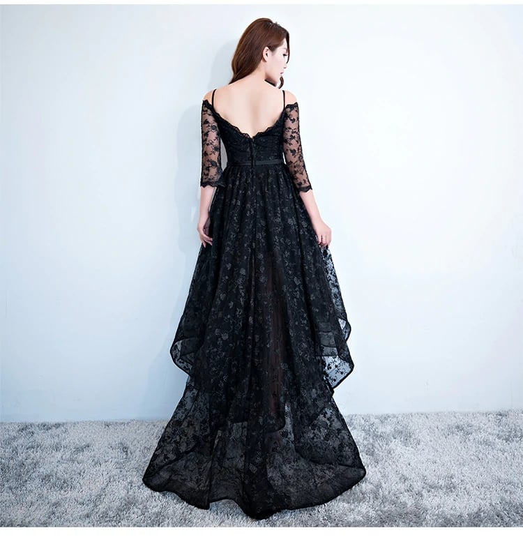Black Lace V-neckline Straps High Low Party Dress Homecoming Dress, Black Formal Dress