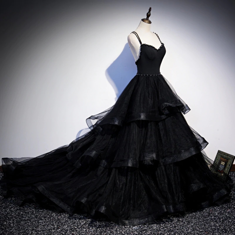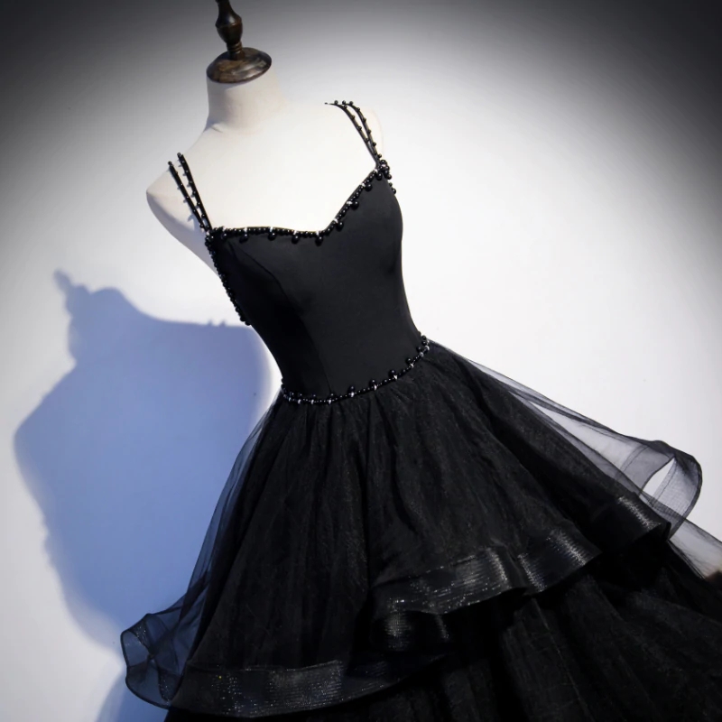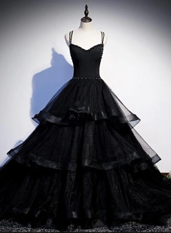 Black Tulle Layers Straps Beaded Long Evening Dress, Black Formal Dress Prom Dress