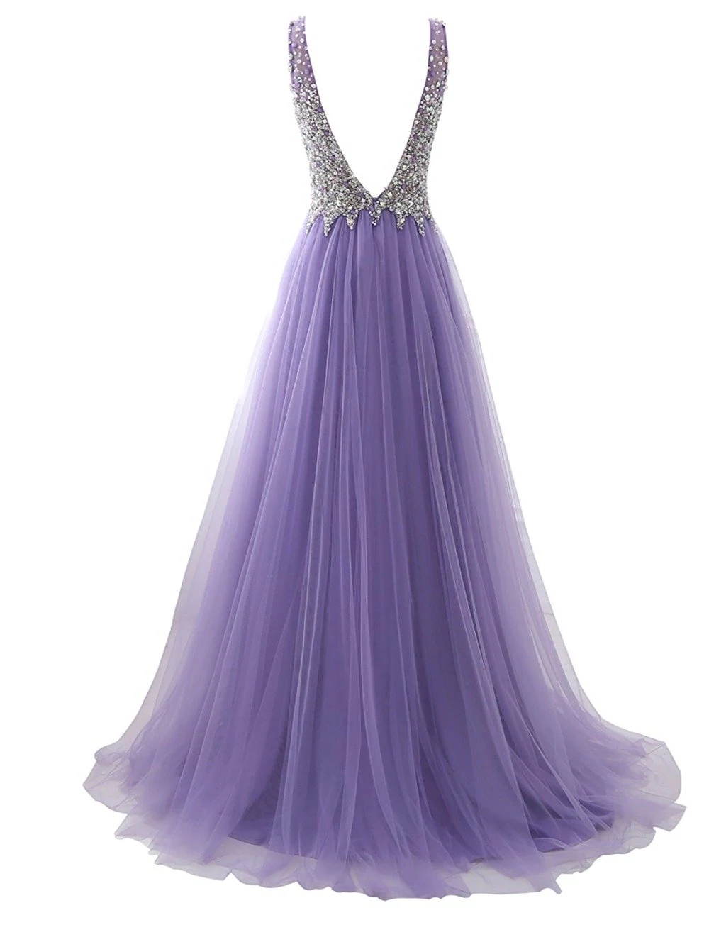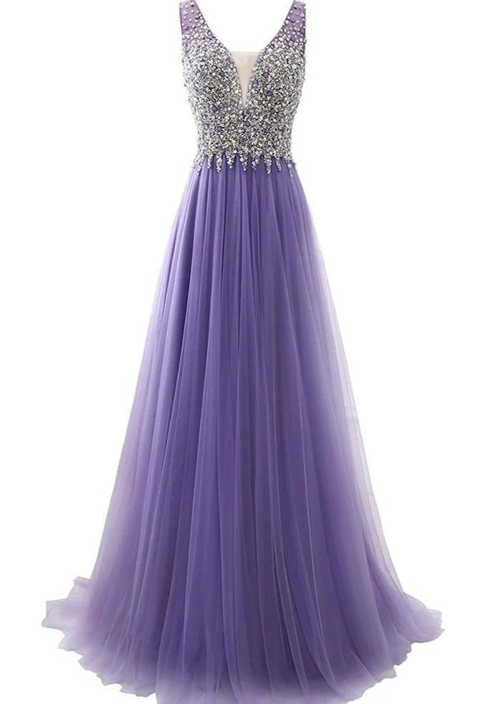 Light Purple Tulle Beaded V-neckline Long Formal Dress, Charming A-line Tulle Prom Dress