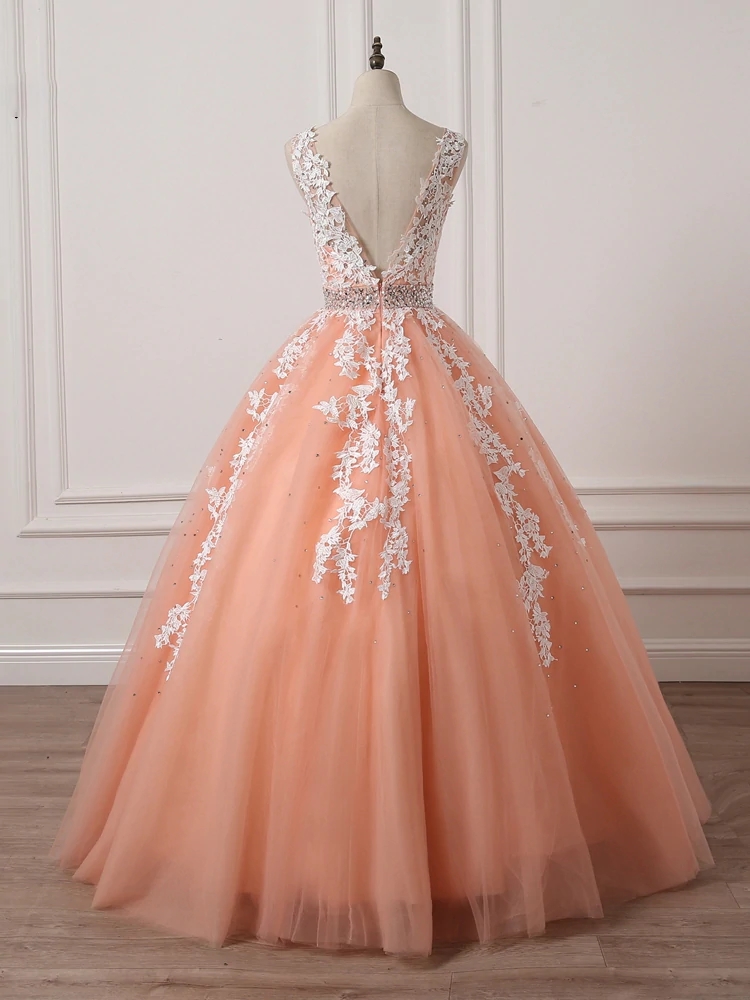 Gorgeous Coral Tulle High Quality V-neck Lace Appliques Beads Party Dress, Long Formal Dress