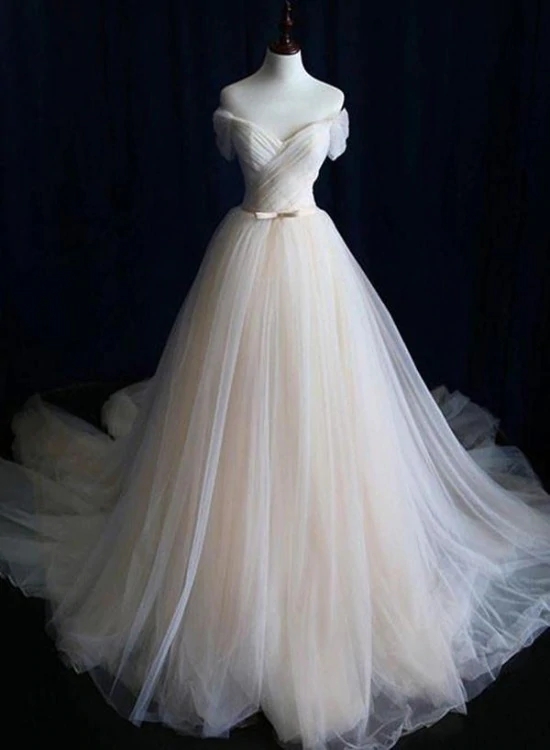 Simple Ball Gown Lace-up Ivory Tulle Off-the-shoulder Wedding Party Dress, Ivory Formal Dress