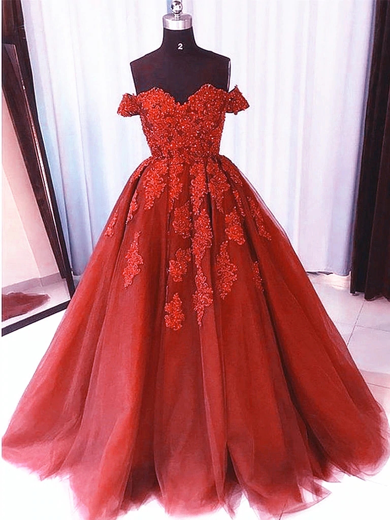 Dark Red Tulle Long Off Shoulder Beaded Lace Prom Dress, Red Sweet Gown