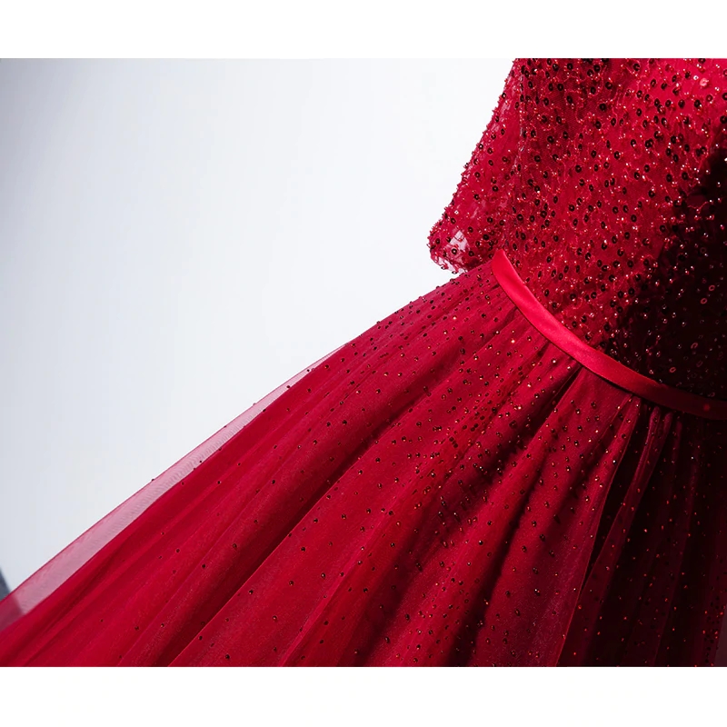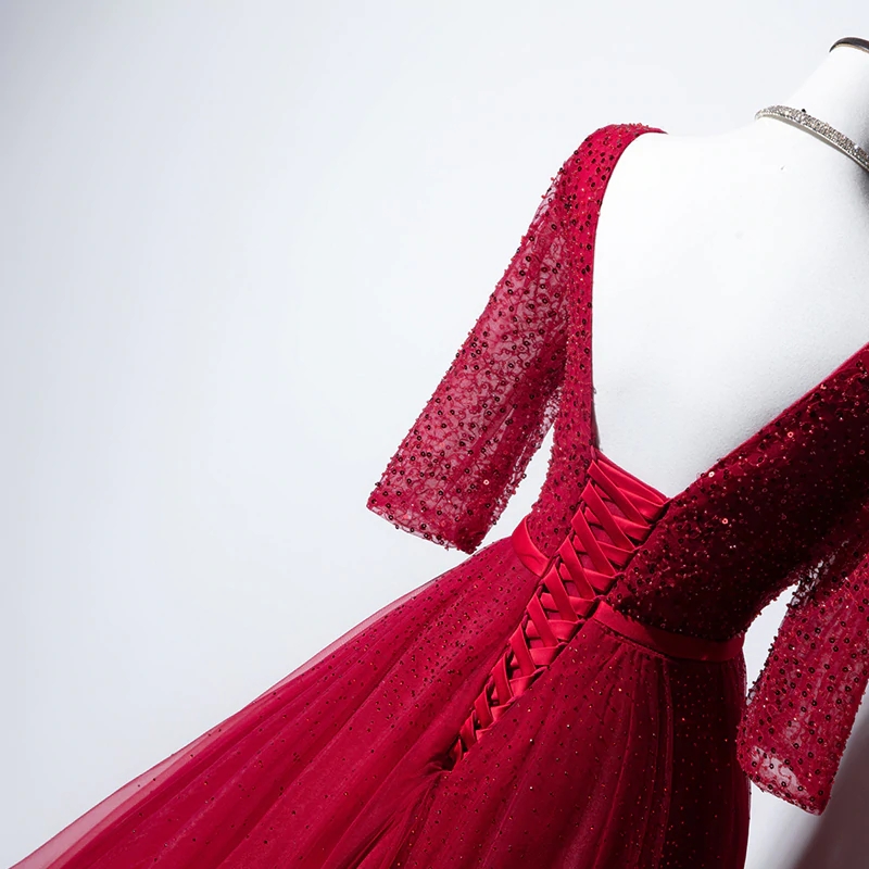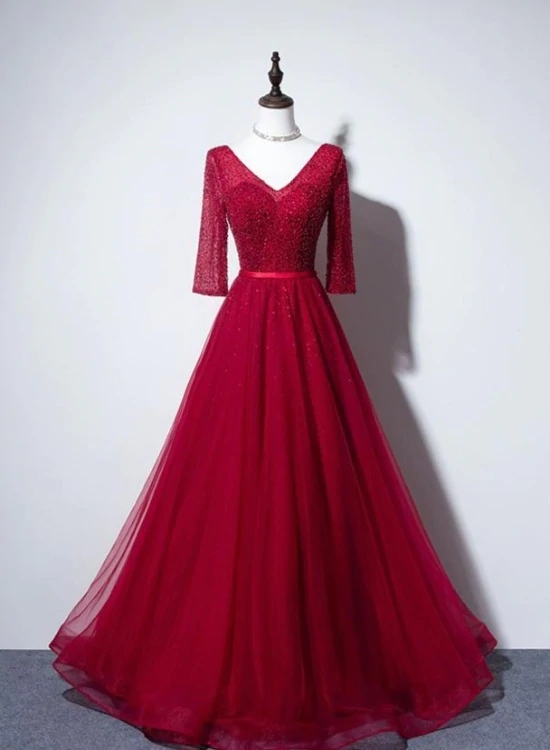 Wine Red Tulle Sequins V-neckline Long Formal Dress, A-line Tulle Prom Dress, Party Dress