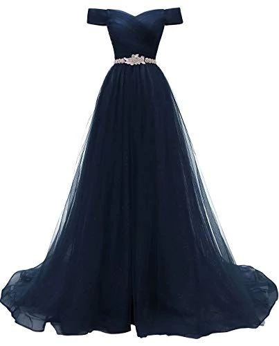 Off Shoulder Navy Blue Party Dress, A-line Tulle Blue Bridesmaid Dress