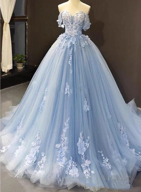 Blue Sweetheart Off Shoulder with Lace Applique Party Dress, Blue Sweet Dress