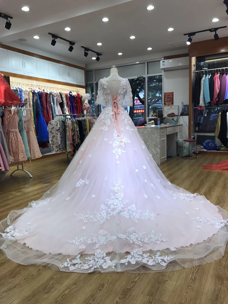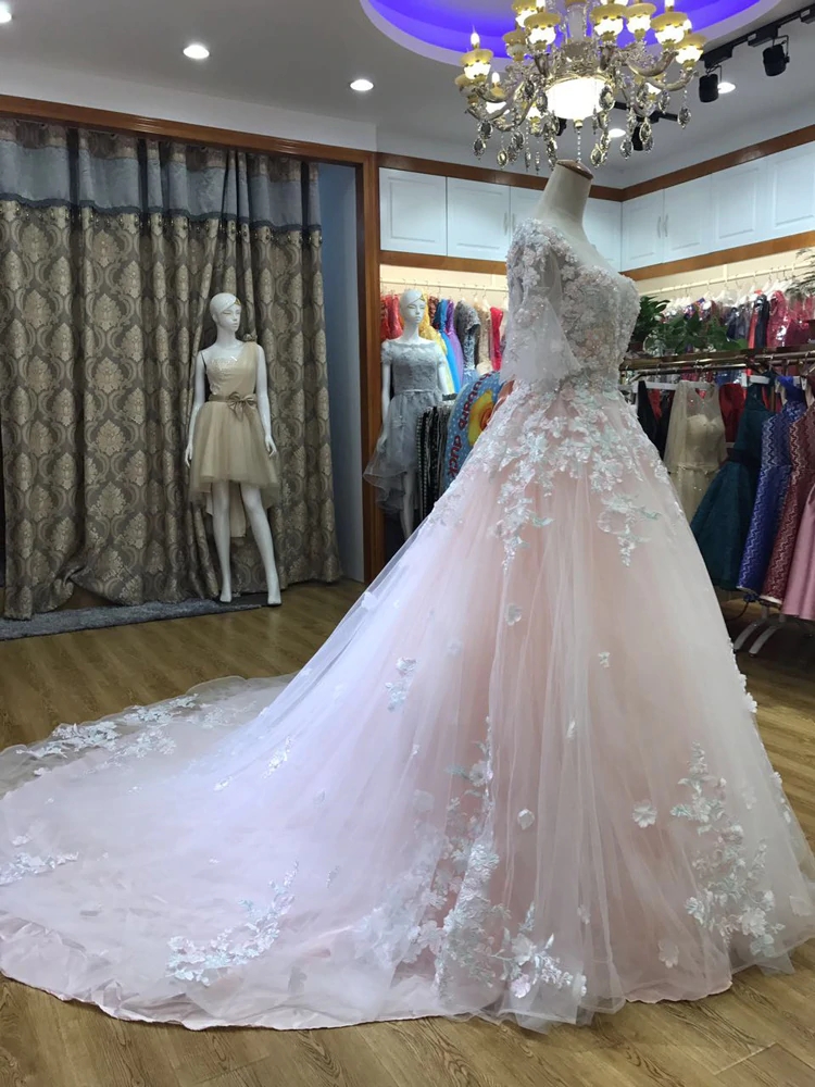 Light Pink Tulle Long Flower Lace Formal Dress, Pink Tulle Sweet Dresses